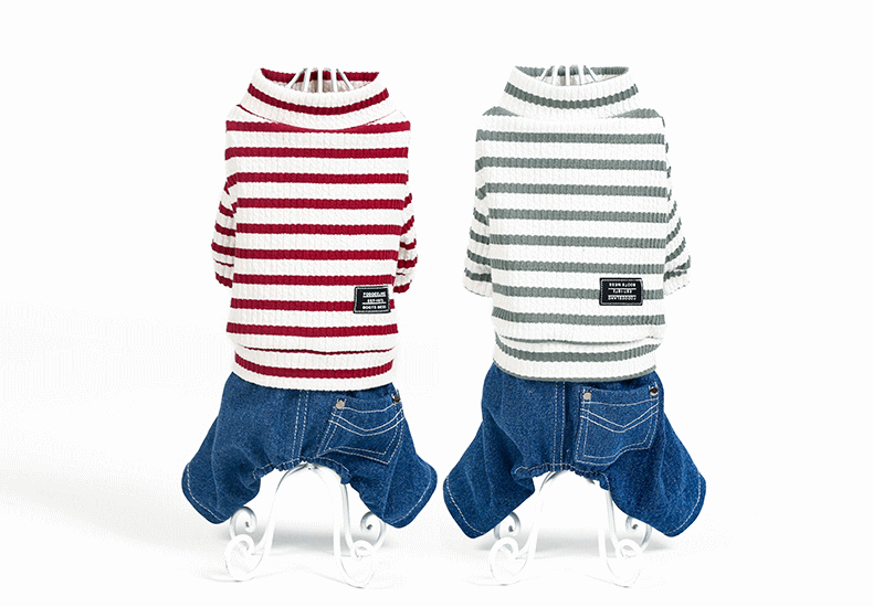 犬服 サロペット カバーオール 小型犬 中型犬 長袖ボーダー 長ズボン おしゃれ かわいい【あす楽対応】【メール便1枚迄可】 デニム・ボーダーでカジュアルなデザイン 伸縮性ある柔らかなリブニット、足内側とお尻の縁はゴム仕様簡単に着脱できます。