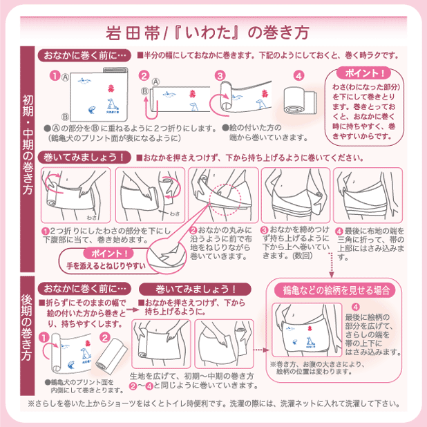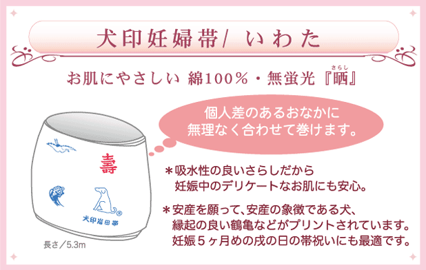 大きくなったおなかを締め付けたり圧迫したりしないよう、下から持ち上げることで、腰への負担を軽減し、体の姿勢バランスを安定させサポートしてくれる、妊婦さんの強い味方! 妊娠中期から後期まで、いろんなタイプの妊婦帯の中から、 ライフスタイルに合ったマタニティインナーを選んで、プレママ時期を楽しく過ごしましょう! かわいいワンちゃんと、縁起の良い、鶴亀「壽」の文字がプリントされています帯祝い・安産祈願におすすめの1枚です。