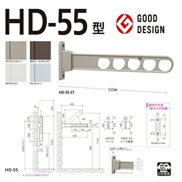 川口技研の一覧はこちら アーム長さ550mmベース寸法34mm×160mm外から洗濯物を見られたくない、美観を損ないたくない・・・そんな願いを叶える腰壁取り付け用タイプの物干し。