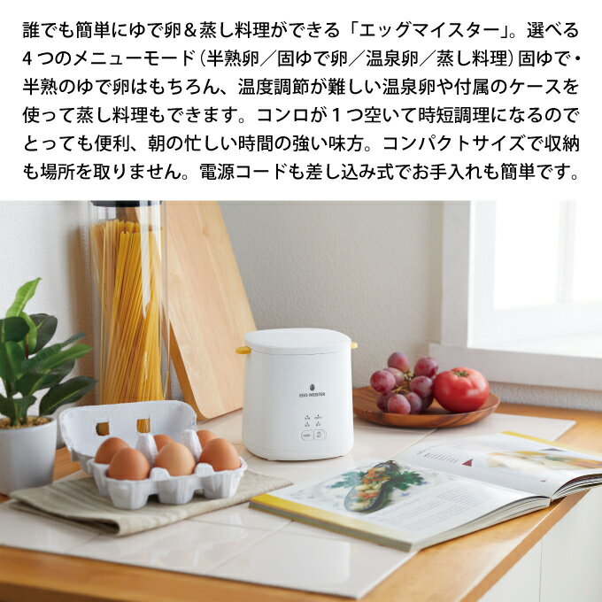 誰でも簡単にゆで卵&蒸し料理ができる「エッグマイスター」 選べる4つのメニューモード(半熟卵/固ゆで卵/温泉卵/蒸し料理) 固ゆで・半熟のゆで卵はもちろん、温度調節が難しい温泉卵や付属のケースを使って蒸し料理もできます。