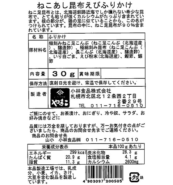【検索用キーワード】山小 小林食品 こばやししょくひん コバオヤシショクヒン ふりかけ 北海道 ねばねば ねこあし昆布 えび 旨み コク 北海道産 甘エビ 昆布 ふりかけ 鰹節 鰯節 カルシウム ねこあし昆布えびふりかけ30g ねこあし 昆布えびふりかけ 30g 食材 調味料 ごはんのおとも北海道産甘エビに昆布を混ぜたサクサクでねばねばのふりかけです。