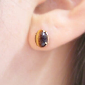 つややかなブラウンの光沢の中にシャトヤンシー(キャッツアイ効果)とよばれる黄金のひとすじが浮かび上がって、とっても神秘的・・!思わずハッと目をひく存在感です!ミステリアスな雰囲気のジュエルを、リッチ&ノーブルに見せるゴールドで仕上げて、大人の魅力たっぷりの色っぽい雰囲気・・!横顔を、印象的に演出してくれますよ。