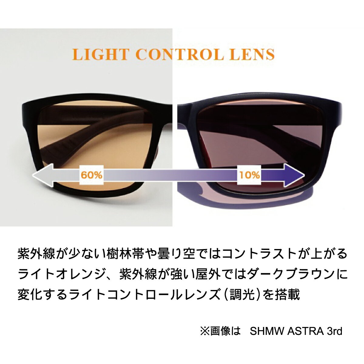 品名:アウトドア調光サングラス フレーム材質:プラスチック(TR90) テンプル材質:プラスチック(超軽量弾性樹脂) レンズ材質:プラスチック(ポリカーボネート) レンズの種類:調光レンズ(偏光機能無し) 可視光線透過率:Lt.BROWN60% 〜 Dk.BROWN10% 紫外線透過率:1%未満 サイズ(mm) ・SHMW ASTRA 3rd [ レンズ幅55mm 縦40mm ] ・SHMW SHARON [ レンズ幅52mm 縦42mm ] 重量 ・SHMW ASTRA 3rd : 28g ・SHMW SHARON : 27g 同梱物 ・フレーム(枠)レンズ付 ノーズパッド付 ・アクティブテンプル ・ベースマグネット 吸盤(取付済)/両面シール(任意使用) ・眼鏡拭き兼用布ケース 〇使用方法と取り扱い上の注意 ・テンプルがしっかり結合されていることを確認してからご使用ください。